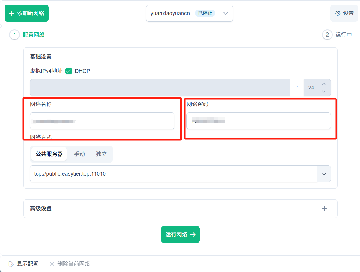 此处只需所有组网的设备输入同一网络名称和网络密码后运行网络即可加入虚拟局域网。